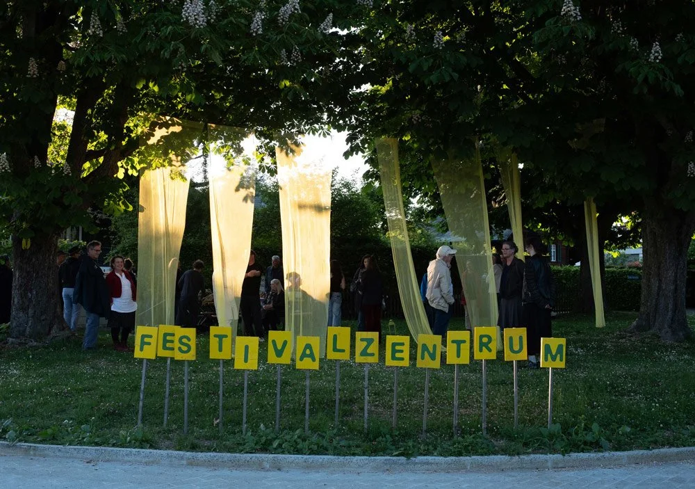 Für die Ausstellung Revue der Vorgärten am 21. Juni 2025 im Kunsthaus Kreuzlingen steuerte ich die drei Filme von Arbon, Weinfelden und Warth bei. Es entstand eine Videoinstallation mit den gelben Stoffbahnen, die wir beim Festival zum Schmücken des Treffpunkts verwendet hatten.